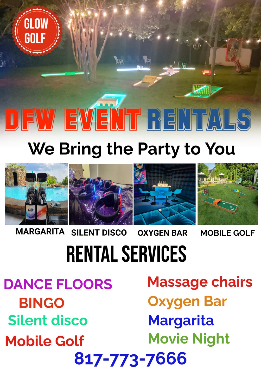 DFW Event Rentals is a Fort Worth–based company offering a wide range of party and event rental services, from margarita machines and mobile bars to LED dance floors, silent disco, oxygen bars, and more.