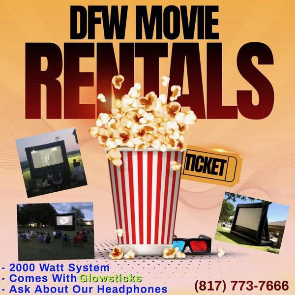 Movie night is a fun way to sit back and watch a movie with a 16×9 inflatable screen that comes with a 2000 watt sound system projector, dvd player plus a A Attendant . Get the popcorn out and enjoy your favorite movie. We are located in fort worth tx